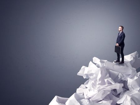 Thoughtful young businessman standing on a pile of crumpled paper with a dark grey background