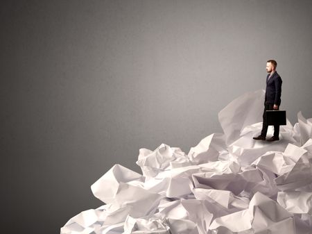 Thoughtful young businessman standing on a pile of crumpled paper with a deep grey background