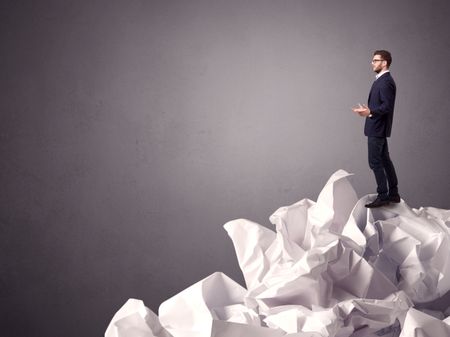 Thoughtful young businessman standing on a pile of crumpled paper with a grungy grey background