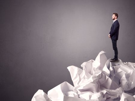 Thoughtful young businessman standing on a pile of crumpled paper with a grungy grey background