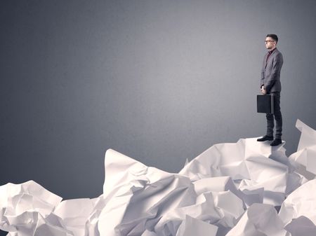 Thoughtful young businessman standing on a pile of crumpled paper with a grey background