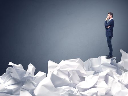 Thoughtful young businessman standing on a pile of crumpled paper with a blueish grey background