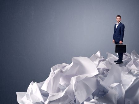 Thoughtful young businessman standing on a pile of crumpled paper with a light grey background