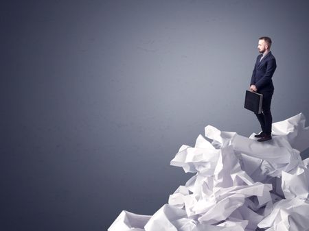 Thoughtful young businessman standing on a pile of crumpled paper with a dark grey background