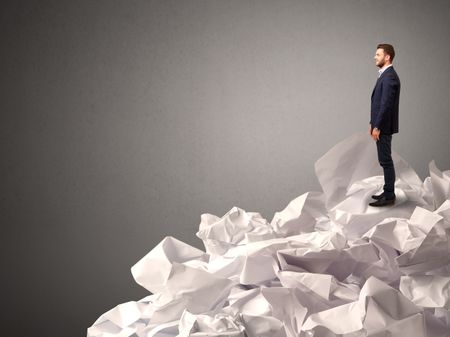 Thoughtful young businessman standing on a pile of crumpled paper with a deep grey background