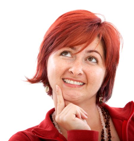 Thougthful woman with red hair isolated over white