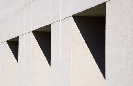Three pennant-shaped shadowed recesses of exterior wall of university building in afternoon sunlight