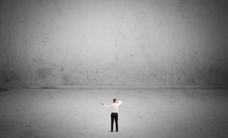 A tiny elegant businessman standing in large empty urban space with concrete walls and grey background concept