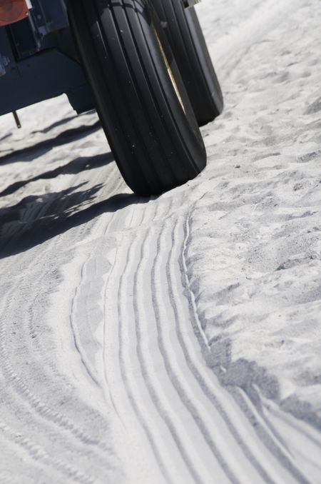 Tire tracks of beach buggy in white sand