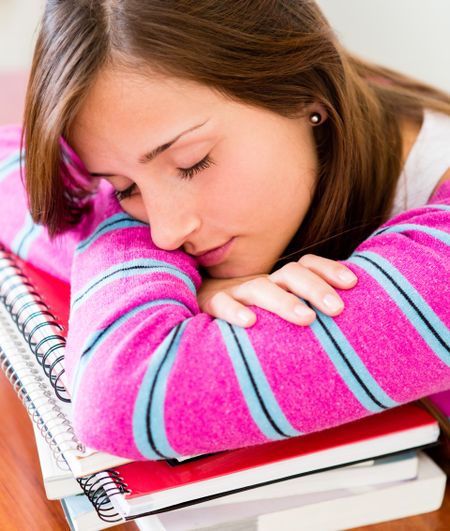 Tired female student falling asleep while studying