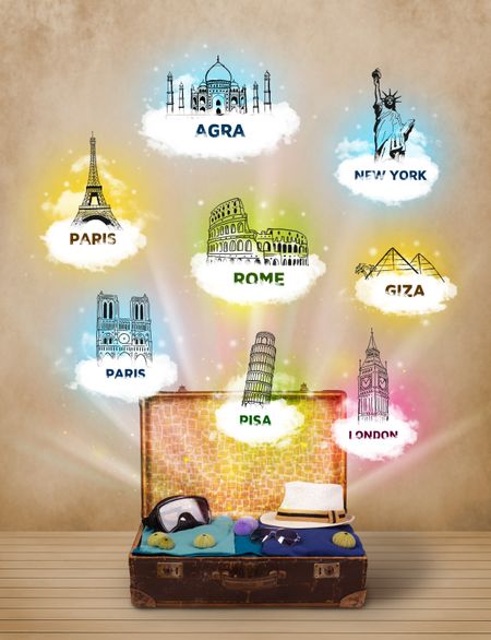 Tourist suitcase with famous landmarks around the world on grungy background