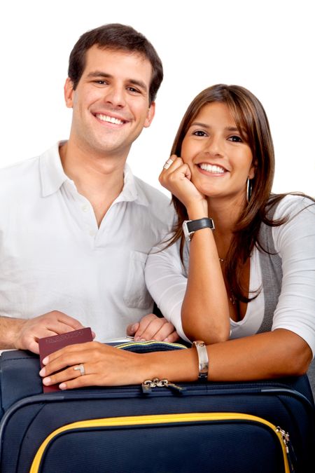 Travelling couple with their luggage isolated over white