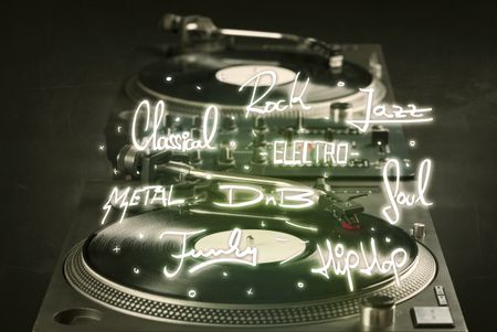 Turntable with vinyl and music genres writen concept on background