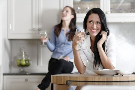 Two attractive young friends laughing and drinking wine in their kitchen.