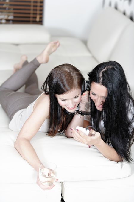 Two beautiful young woman listening to music on headphones at home on the sofa.