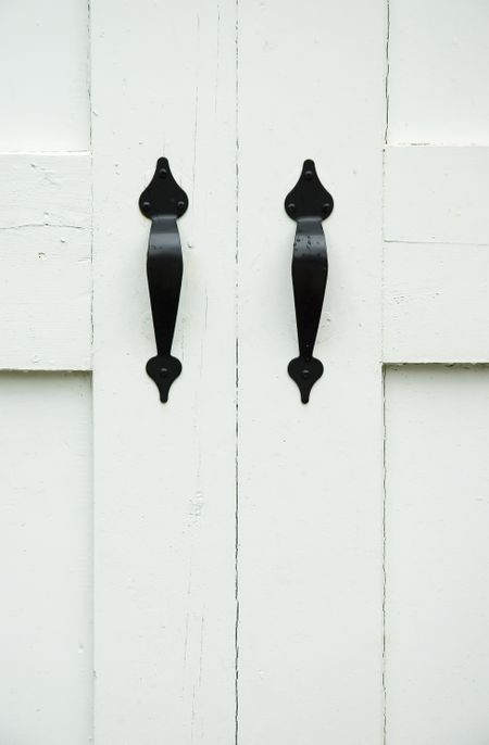 Two black iron handles with a few raindrops on white wooden doors