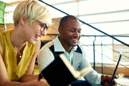 Two creative millenial small business owners working on social media strategy using a digital tablet while sitting in staircase
