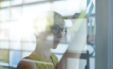 Two creative millenial small business owners working on social media strategy brainstorming using adhesive notes in windows