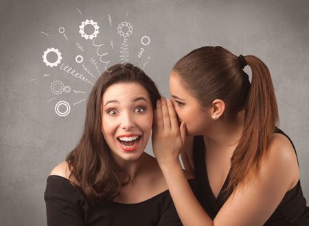 Two girlfriends in elegant black dress sharing secrets with each other concept with drawn rack cog wheels and spiral lines on the wall background.