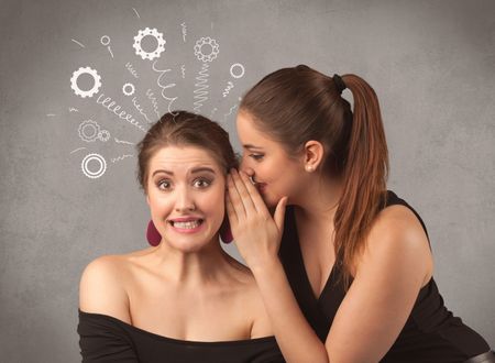 Two girlfriends in elegant black dress sharing secrets with each other concept with drawn rack cog wheels and spiral lines on the wall background.