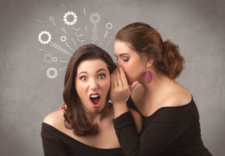 Two girlfriends in elegant black dress sharing secrets with each other concept with drawn rack cog wheels and spiral lines on the wall background.