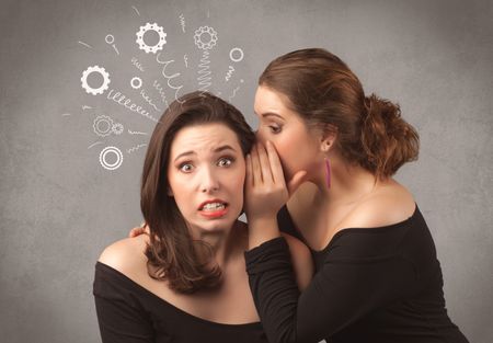 Two girlfriends in elegant black dress sharing secrets with each other concept with drawn rack cog wheels and spiral lines on the wall background.