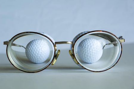 Two golf balls behind thick lenses of eyeglasses