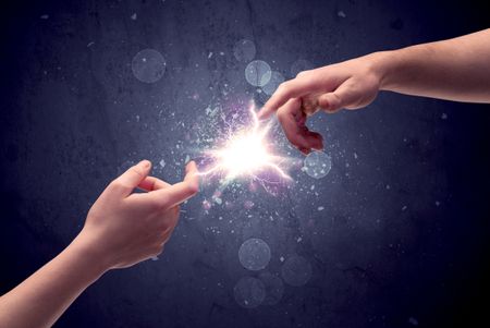 Two male hands reaching towards each other, almost touching with fingers, lighting spark in galaxy background concept