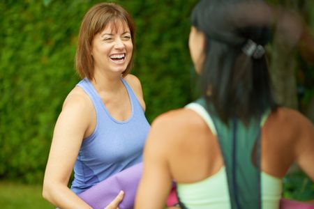 Two mature women talking before doing yoga in the summer