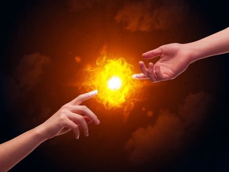 Two naked male hands about to touch, lighting a bright flame with smoke in red sky background concept