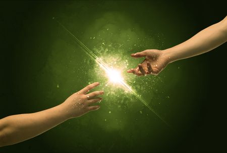Two naked male hands about to touch, lighting the spark with modest explosion in front of green background concept