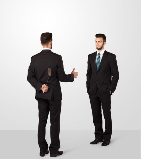 Two opposing businessman shake hands, one of them hiding a weapon behind his back