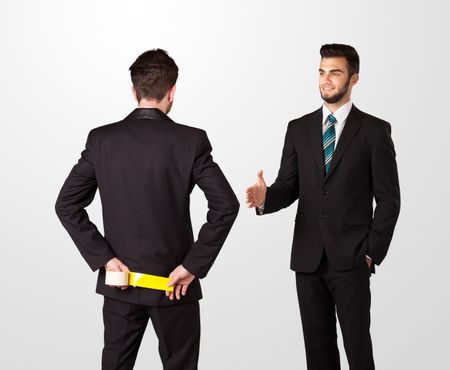 Two opposing businessman shake hands, one of them hiding a weapon behind his back