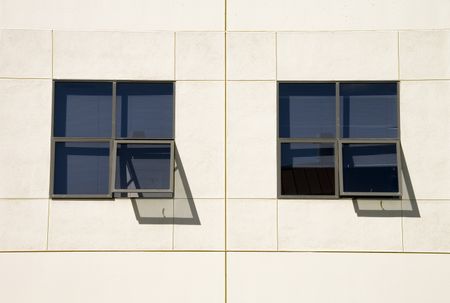Two similar sets of windows, two shadows, exterior whitewashed wall in sunlight