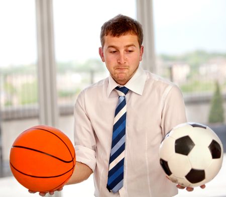 Undecided business man between basketball or football