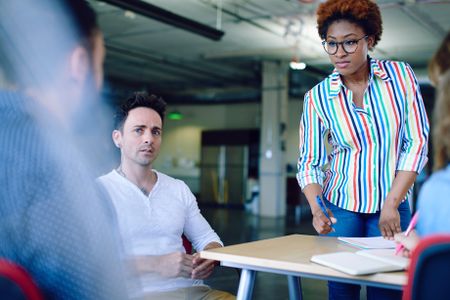 Unposed group of creative business people in an open concept office brainstorming their next project.