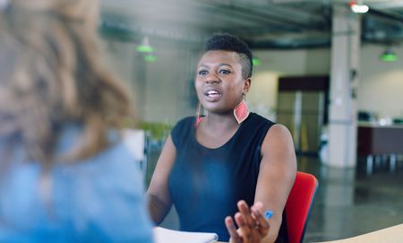 Unposed group of creative business people in an open concept office brainstorming their next project.