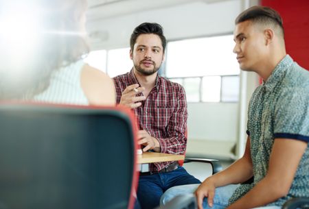 Unposed group of creative business people in an open concept office brainstorming their next project.