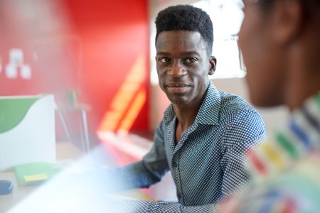 Unposed group of creative business people in an open concept office brainstorming their next project.