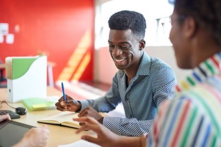 Unposed group of creative business people in an open concept office brainstorming their next project.