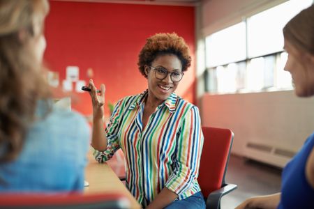 Unposed group of creative business people in an open concept office brainstorming their next project.