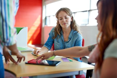 Unposed group of creative business people in an open concept office brainstorming their next project.