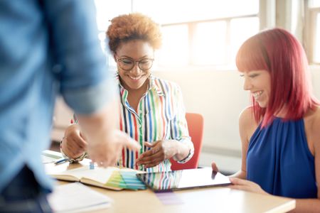 Unposed group of creative business people in an open concept office brainstorming their next project.