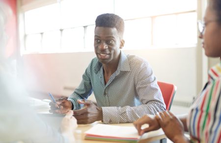 Unposed group of creative business people in an open concept office brainstorming their next project.
