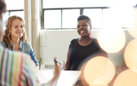 Unposed group of creative business people in an open concept office brainstorming their next project.