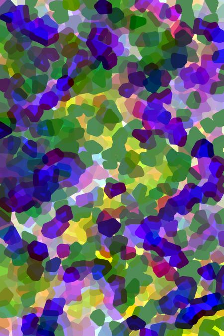 Varicolored abstract of many blobby, overlapping polygons that seem to float like blood cells, for themes of mixture and suspension, numerousness and aggregation