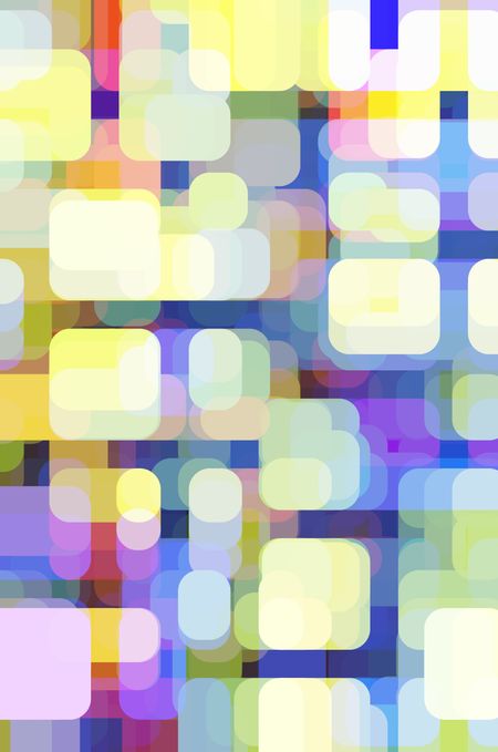 Varicolored abstract of rounded squares and rectangles overlapping for 3-D effect, like so many city lights, some brighter than others, at various distances