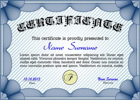 Vector illustration of blue horizontal certificate, diploma or coupon template, with very complex border design, background, and sample text.