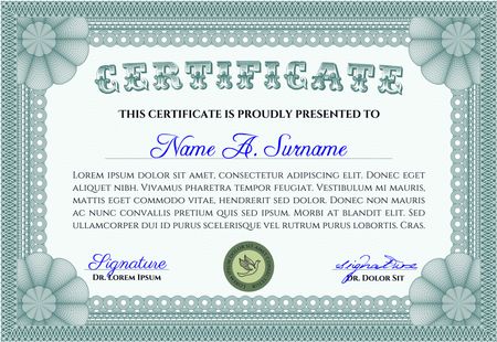 Vector illustration or horizontal certificate, diploma or coupon template. Very complex border design. With background and sample text.