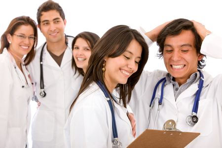 Very happy group of doctors isolated over a white background